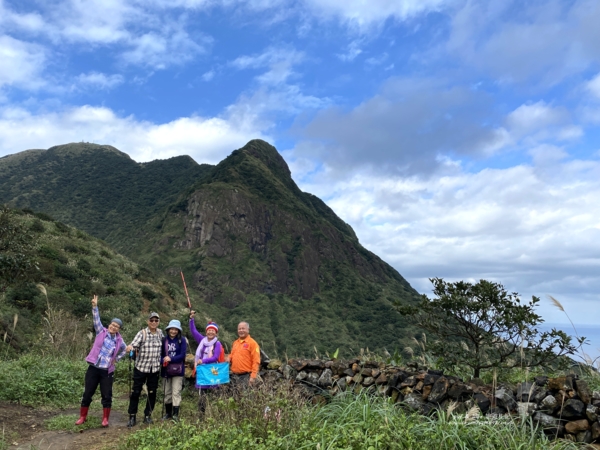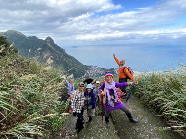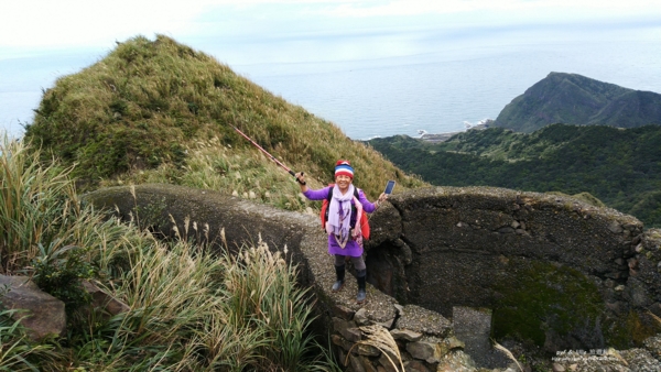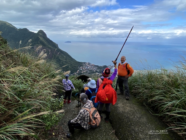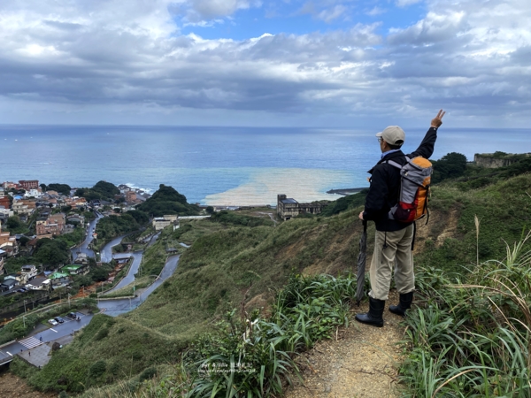 但這兒向下看「九份溪」出海口兩岸的「水湳洞」社區、「陰陽海」和一片蔚藍「東海」,還有左邊高聳的「基隆山主峰」,黃金十稜中第一稜險峻陡峭的「雷霆峰」,右邊的「南子吝山」,更遠的「鼻頭角」海岬,視野特別清晰。