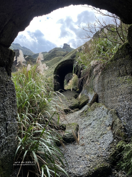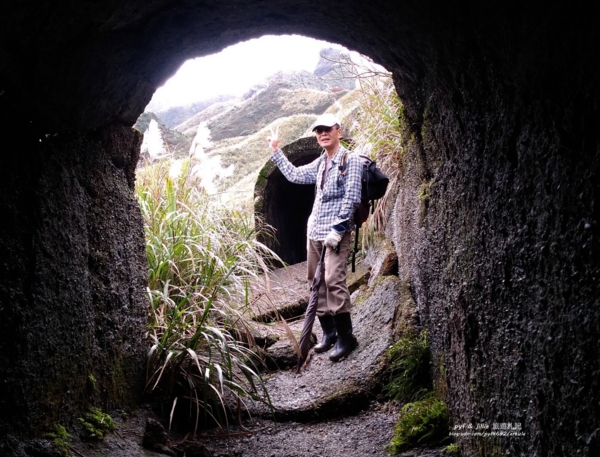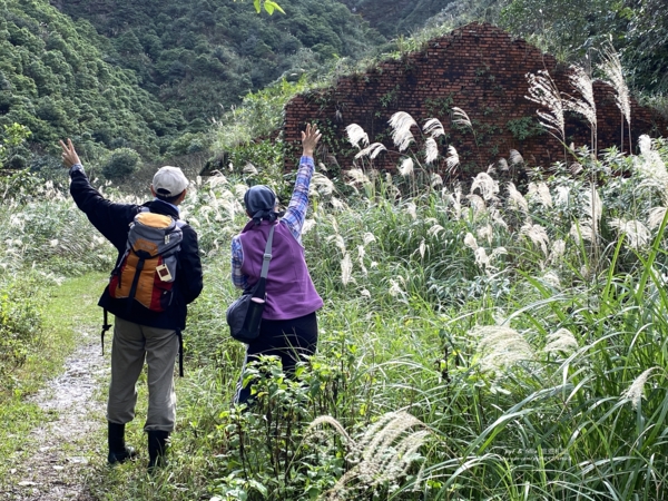 接著我們穿梭在荒山芒草中,探訪「金瓜石」著名的地標之一,黃金十稜中第二稜「煙囪稜」的巨蟒「廢煙道」。
