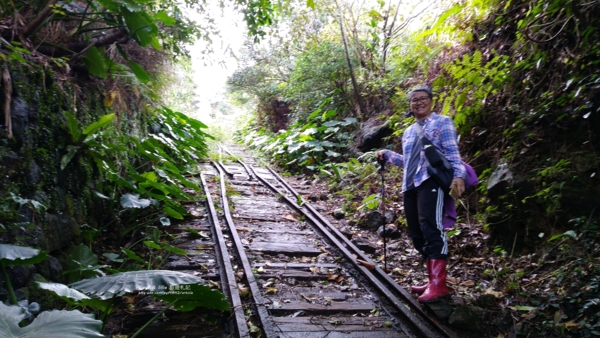 循著看來保持尚可的「六坑斜坡索道」遺跡,這條距今近百年運送礦產及物資的軌道,長317公尺,海拔落差約105公尺,陡度達45度,繼續往上到殘破的磚造索道機械房的「天車間」,也到了「勸濟堂」的停車場旁。