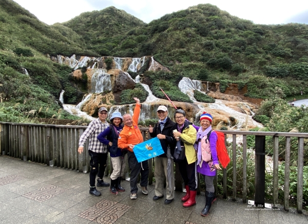 從「瑞芳」轉乘856公車(台灣好行/黃金福隆線),於「黃金瀑布」站下車。今天瀑布不大不小,長年和礦物經過化學反應後水色帶有氧化後的金屬礦石顏色,加上裸露的石塊也是黃赭色,倘流在青綠山壁上,襯著灰白淡藍的天空,有一種特殊的美。
