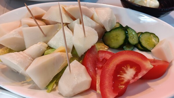 知道Bank很注重飲食,我們點了涼拌筍、炸紅燒肉、炒透抽、肉絲炒飯、什錦湯米粉和丸子湯,舒適接受老闆娘包場的款待。