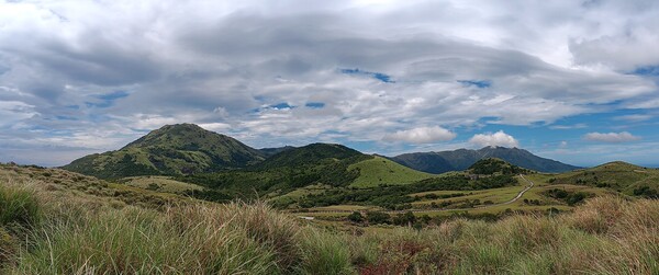 好天氣的「擎天崗草原」放大景,近處的圍欄步道,遠處的石梯嶺、嶺頭喦土地公、七股山、七星山,更遠的竹子山,青綠山巒疊嶂,煞是令人心胸隨之開闊。
