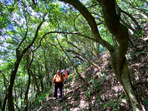 此後,便循山腰蜿蜒原始泥土路徑,隊伍輕鬆得像小學生遠足一般,遇有寬闊處便休息,一路愉悅、歡樂。