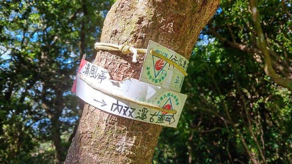 其間,常會出現步道橫向交會岔路,且郊山本就因耕作或崩塌多有岔路或改道,但,今日走來注意看,岔路多有方向標示,也有布條,何況路徑清楚,不致迷路。