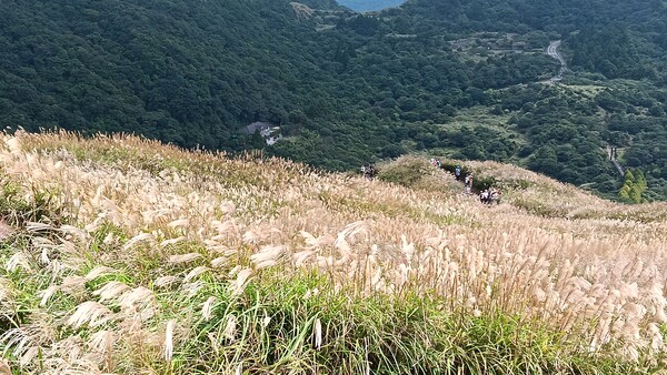 遠處天際往七星山東峰的山徑上,人群如過江之鯽,絲毫沒讓內心掀起一點漣漪,為了順利坐上車,拍完照就下山。