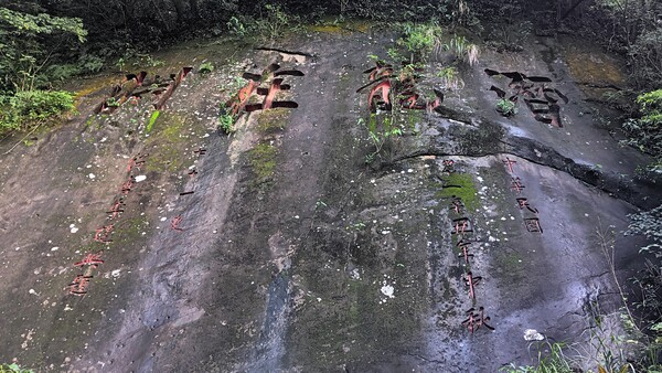 前段看似翻越一段清幽綠樹成蔭無人煙的寂靜小山,卻在秀崎山下看到一座大石壁,上面有瑞三礦業董事長李建興題的「潛龍在淵」深邃有力的四個大字石碣,想來這條荒煙道路,早年應該蠻風光的。