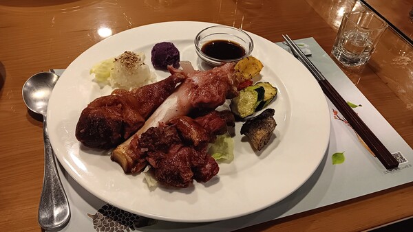 我的主食是德國豬腳,外皮焦香酥脆 ,內肉Q彈有勁,配上2~3青蔬,一團紅豆泥,真是美味。