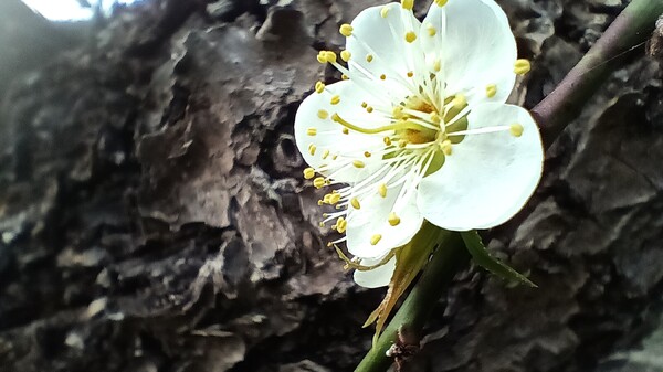 蒼勁的枝幹與潔白花朵相襯,還有遠處高山的背景,真是一幅詩情畫意的水墨意境。
