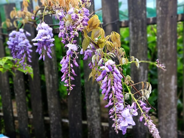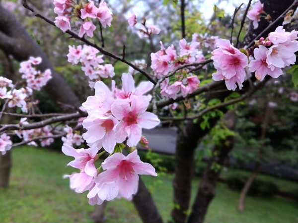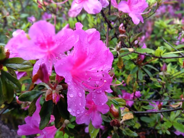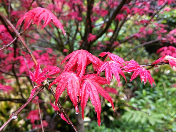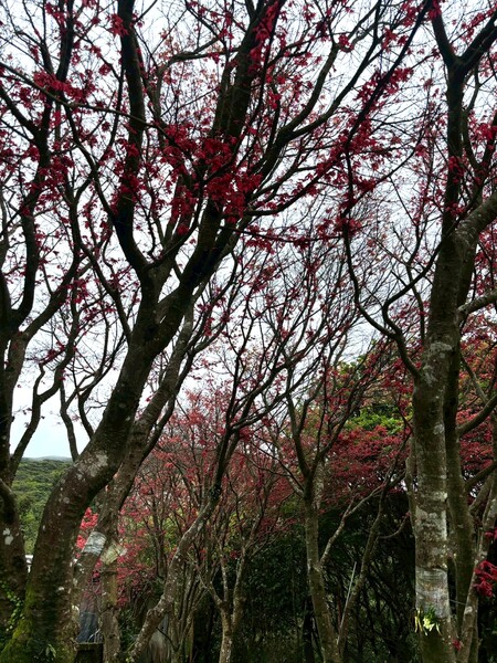 這季節還有歷經昨夜大雨洗滌,仍垂帶晶瑩水珠的紫藤、杜鵑、紅葉青楓,格外惹人憐愛。