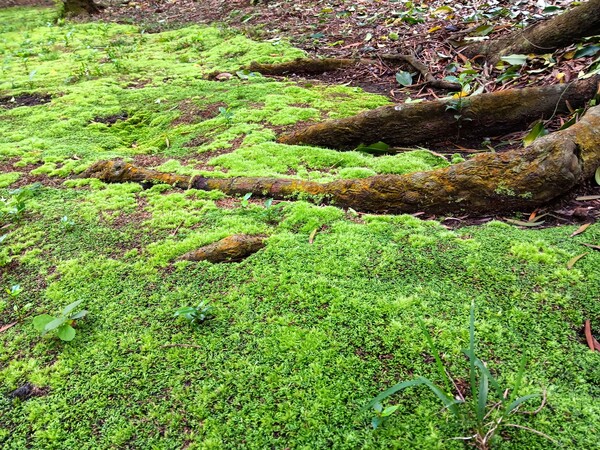 除了正館一、二樓、中式庭園、停機坪,幾顆結實累累樹幹斑駁蒼勁的梅樹,還有一座占地頗廣的森林公園,許是少人走動,一條蜿蜒步道兩旁長的苔蘚甚為青綠動人,顯得公園更靜謐而幽遠。