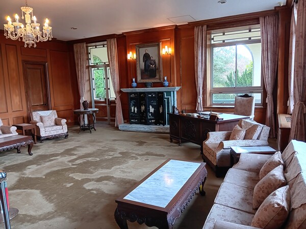 今天意外的是,導覽一幢約有300坪二層樓中國庭園式風格的總統官邸正館建築,尤其二樓室外走廊寬闊視野無敵,但,想來隱密是這建築的重點,總統應該沒有機會佇立於此賞景吧!