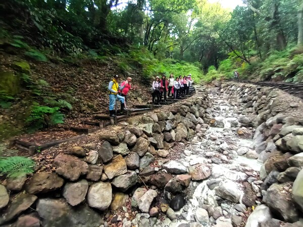很快下到中興路口便轉往紫明溪步道,這條2023年才完工的步道,全段 665 公尺皆鋪設回收木屑,步道中段更有天然硫磺湧泉的泡腳池(其實這兒附近就是磺溪的源頭) 。