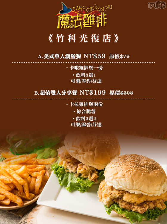 外帶:只要59元起即可享有【魔法雞排《竹科光復店》】原價最高308元經典漢堡餐:(A)美式單人餐/(B)超值雙人分享餐。