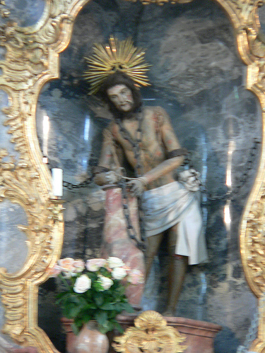 在1730年威斯附近的石園修道院( Steingaden Monastery )為配合「基督受難日」的遊行,準備一尊「被鞭打的基督木雕像」,只因雕像繪有佈滿鮮血及遍體鱗傷的慘狀,令當時修道院的神父不忍心將他當街遊行,便將雕像放置在修道院宿舍的閣樓上。於1734年(4年後),宿舍管理員的姪女農婦馬利亞.羅莉(Maria Lori) 獲得允準將雕像帶回威斯農村的家裡,從此和他的丈夫非常虔誠的膜拜禱告,再經過4年(1738年6月14日的晚上),蘿莉突然看到雕像臉頰冒出像淚水一般的水滴,令她十分驚奇的擦掉救世主「慈悲的淚水」,因此神蹟傳聞立刻轟動附近地區,許多信徒爭相前來膜拜。1740年便在牧草地上建立了一座小禮拜堂安奉雕像之後,遠從瑞士、波西米亞、義大利北部、匈牙利等地的眾多信徒,紛紛不辭翻山越嶺、長途跋涉前來朝聖。
