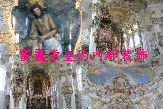 德國威斯教堂概述: 在德國新天鵝堡的富森之東北方約25公里,一片綠色原野的牧草原上,有著一座外觀平實而內部華麗的「威斯教堂」( 已經被聯合國教科文組織列為世界文化遺產 ) 。當時建立教堂的起因,是為了安奉一座曾流出淚水「被鞭打的基督木雕像」,也因此而得名為: The wies pilgrimage Church of the" Scourged Saviour" (威斯「被鞭打的基督」,德文wies=英文Field即「牧草地」之意思。