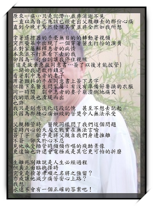 有時我常會猜想著.父親在最後一刻想對我們說的話.但無論我再如何揣測.終究無法印證.