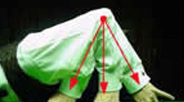 掌握好正確的握桿姿勢后,握桿那只手的前臂自然下垂,以肘關節為支點,向前推動,使球桿槍頭順勢以直線向白色母球撞擊。