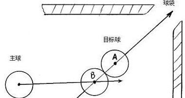 母球擊中目標球的方法無非是直線球,偏球及反彈球,所謂直線球就是母球,目標球和洞口在一直線上,你只需要瞄準槍頭使母球、目標球和洞口在一直線上就ok了;對于打偏球落袋則可以參考下圖的規律,其中A為目標球,需要將母球打到B的位置(即母球與目標球擊打點和目標球中心點以及洞口在一直線上),就可以使目標球落袋,而反彈球也是有一定的規律,但是這和球庫的橡膠彈力系數以及自己的球感有很大關聯,所以這里就不多說了。