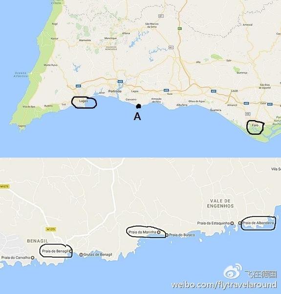 上圖是葡萄牙南部城市法羅(FARO)和拉哥斯(LAGOS)的所在位置,黑色A位置是三個海灘所在地。下圖為放大的三個海灘方位圖,間隔距離都不遠。