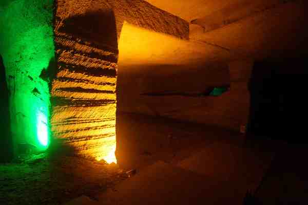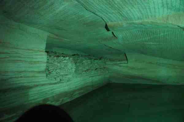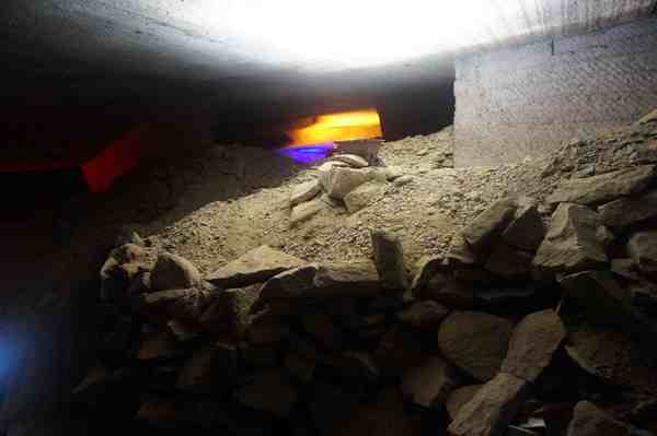 大斜面是在清淤完毕后被发现的,与外面的山坡坡度一致。斜面的石壁上可看到一行行细密的直线型凿痕,线条笔直且连贯,给人的整体感觉很是压抑。这个大斜面的出现提出了一个新的谜团:在科学技术相对落后的古代,匠人们是如何准确判断出斜面的坡度并使之与山体走势吻合呢?