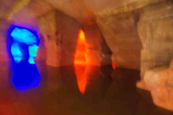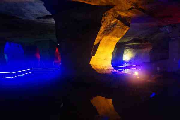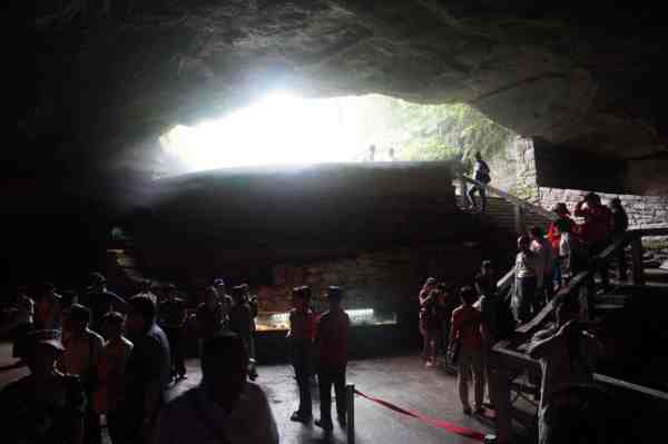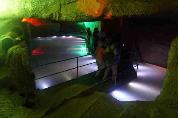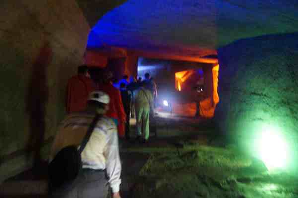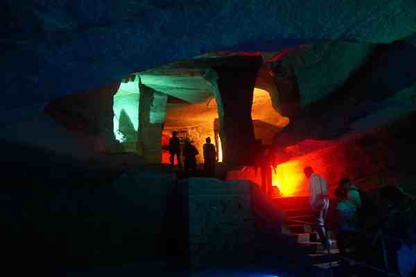 2号窟在半山腰,洞口呈虎口张开之势。入洞后随坡下延,凉气浸淫,回望洞口,早已雾气腾腾。洞内有几十根石柱昂然挺立,组成长80米的地下长廊。右侧有一方形洞口,入内方知廊中有廊。