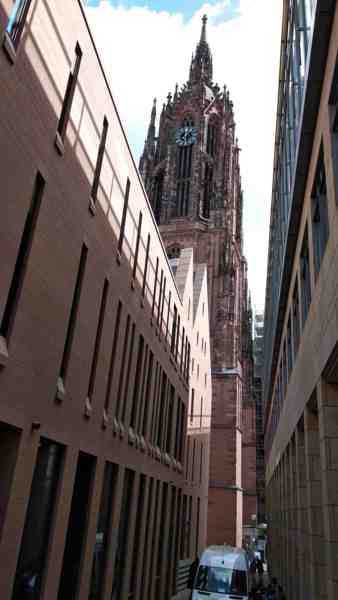 法蘭克福皇帝大教堂 Kaiserdom St. Bartholomaus。建於1250年到1514年的大教堂屬於哥德式建築,它也是法蘭克福最重要的天主教堂。神聖羅馬帝國皇帝選舉自1356年起在教堂內舉行,一直到1792年為止,神聖羅馬帝國皇帝都在這裡舉行加冕儀式,使這裡成為該帝國的重要建築之一。