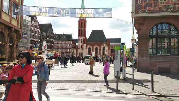 法蘭克福老城區中心:羅馬人廣場。自中世紀以來,這裡即為法蘭克福市政廳廣場。廣場被老尼可教堂、市政廳環抱,廣場中央以正義女神像為視覺中心,成為這座古老城市的主要精神象徵。