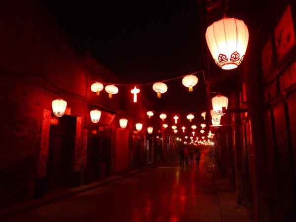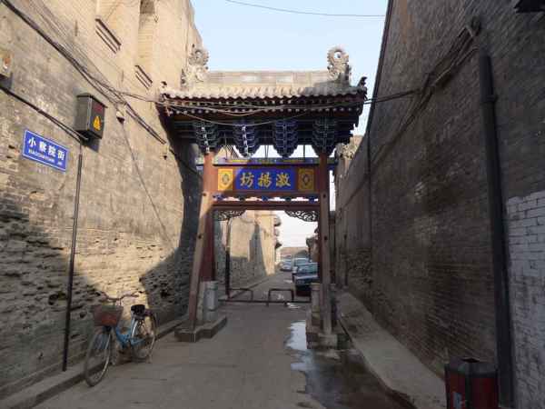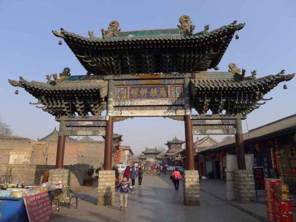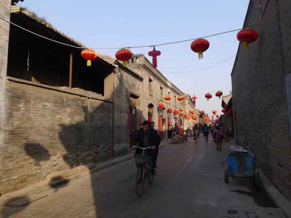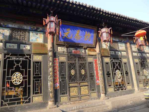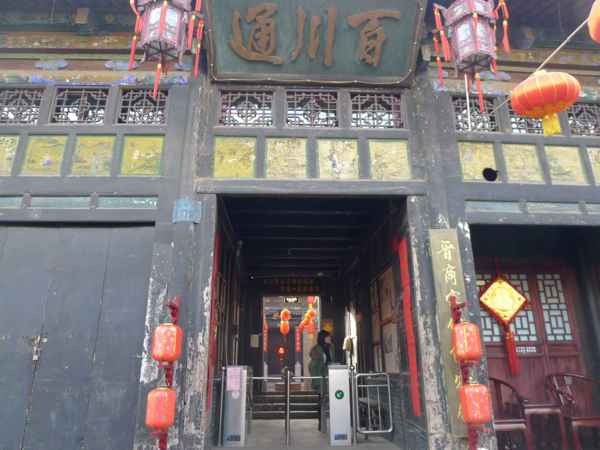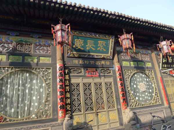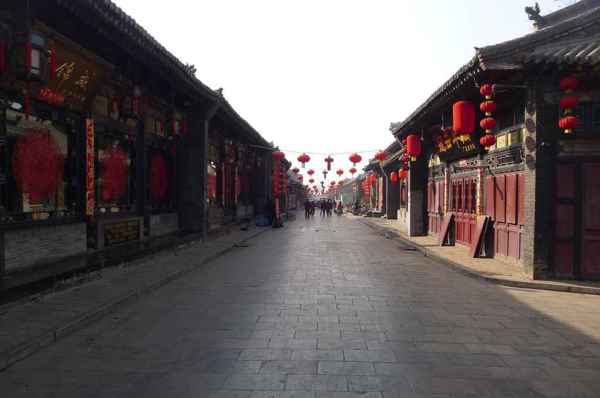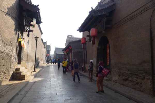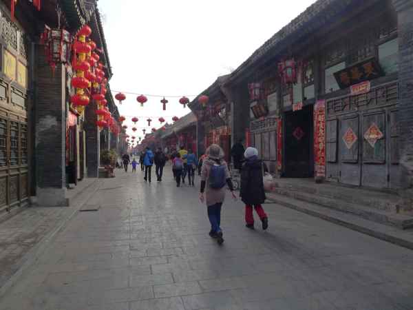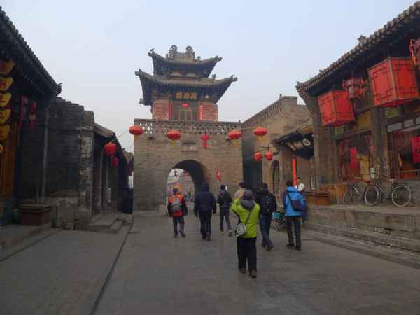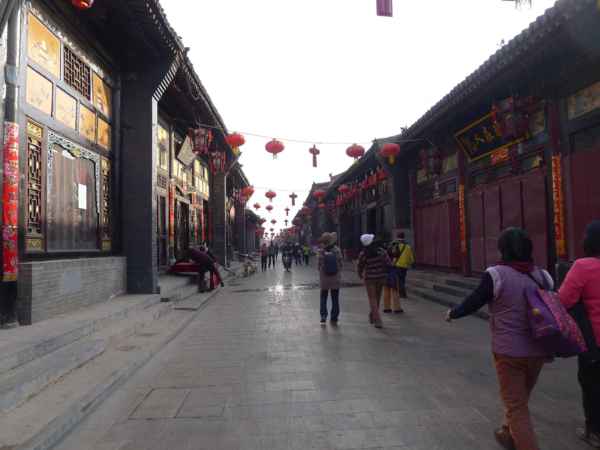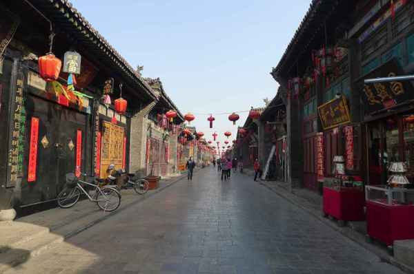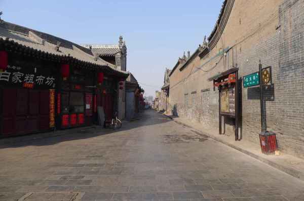 平遙古城內的街道、商店和民居都保持著傳統的布局與風貌。街道呈十字形,商店鋪面沿街而建。鋪面結實高大,檐下繪有彩畫,房梁上刻有彩雕,古色古香。鋪面後的居民宅全是青磚灰瓦的四合院,軸線明確,左右對稱。整座古城呈現出一派古樸的風貌。