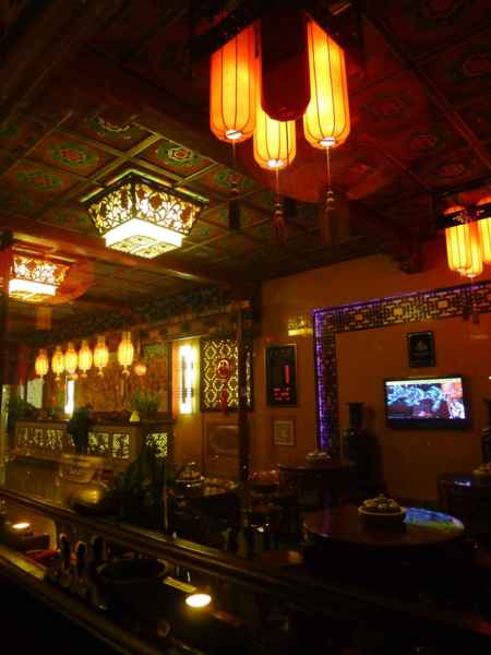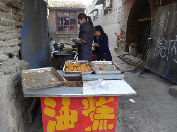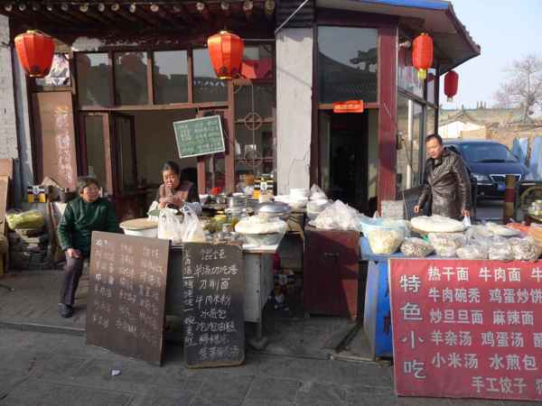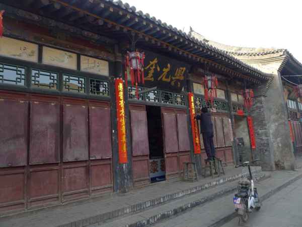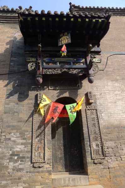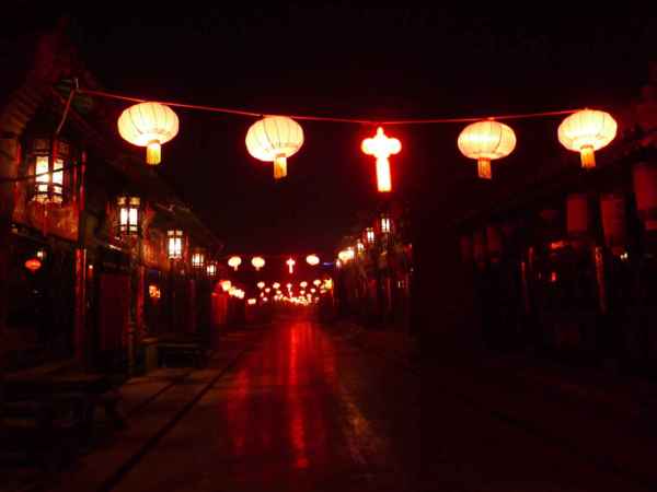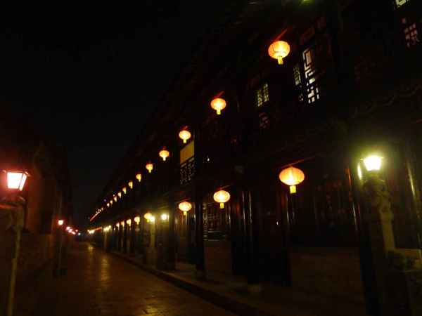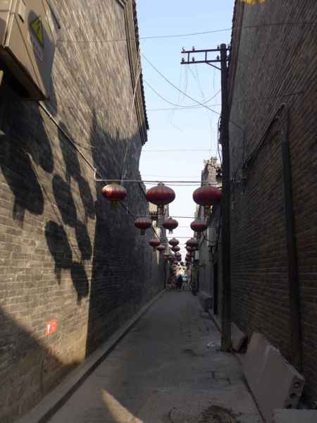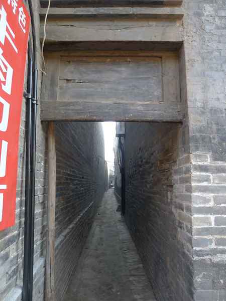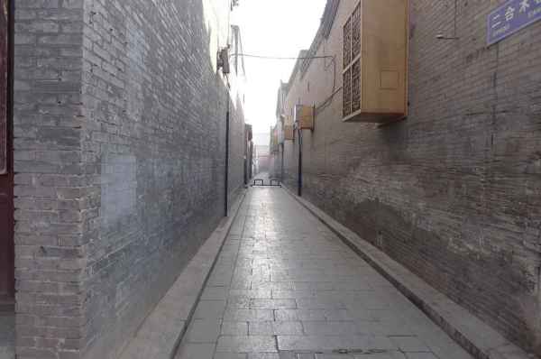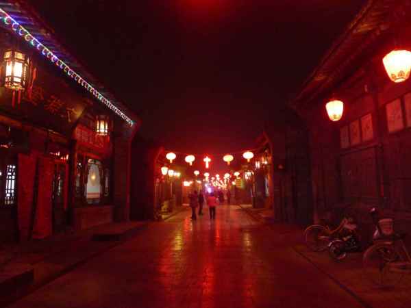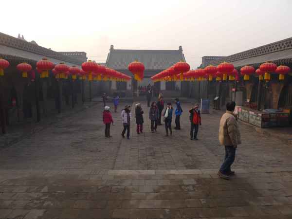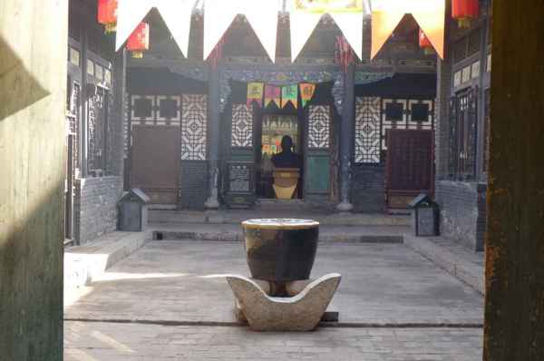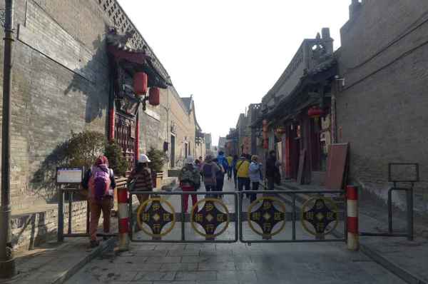 平遙古城內的街道、商店和民居都保持著傳統的布局與風貌。街道呈十字形,商店鋪面沿街而建。鋪面結實高大,檐下繪有彩畫,房梁上刻有彩雕,古色古香。鋪面後的居民宅全是青磚灰瓦的四合院,軸線明確,左右對稱。整座古城呈現出一派古樸的風貌。