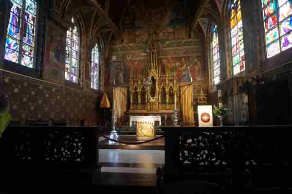 经过多次改建翻新的教堂外观虽然没有布鲁日中世纪建筑的沧桑感,但内部高大的穹顶、精致的彩绘玻璃窗独具弗拉芒天主教建筑简洁大气而又注重细节的风格。