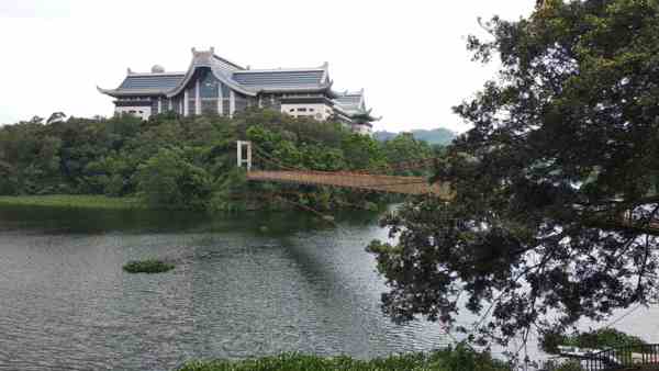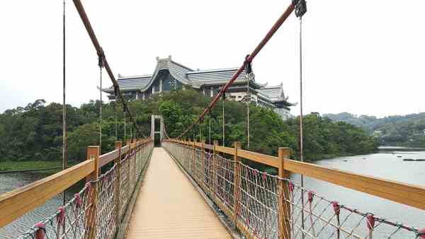 走在吊橋上,峨眉湖瀲灩湖景即映入眼簾, 吊橋的對岸有一棟宏麗壯觀的廟宇,是當地著名的廟宇天恩彌勒院, 現在改稱為「大自然文化世界」。院內有一尊高72公尺的青銅彌勒佛像, 是世界最高的青銅彌勒佛像。