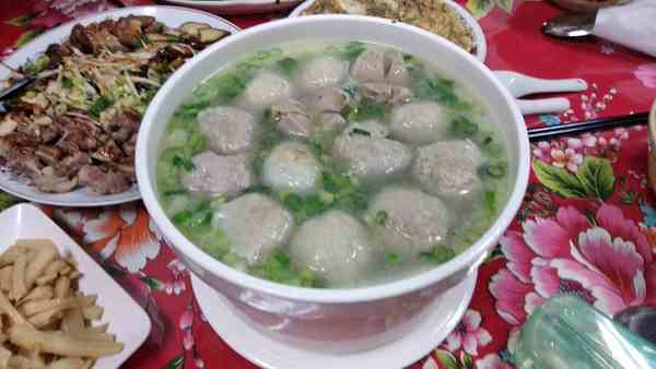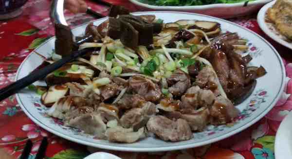 大拼盤、魚丸貢丸湯、素菜3盤、水煮花生、炒筍、二色煎蛋2盤+7碗粄條1碗飯