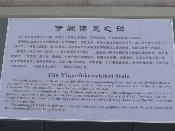 碑刻題記3600餘品,多在伊水西岸。數量之多位於中國各大石窟之首。其中「龍門二十品」是書法魏碑精華,唐代著名書法家褚遂良所書的「伊闕佛龕之碑」則是初唐楷書藝術的典範。