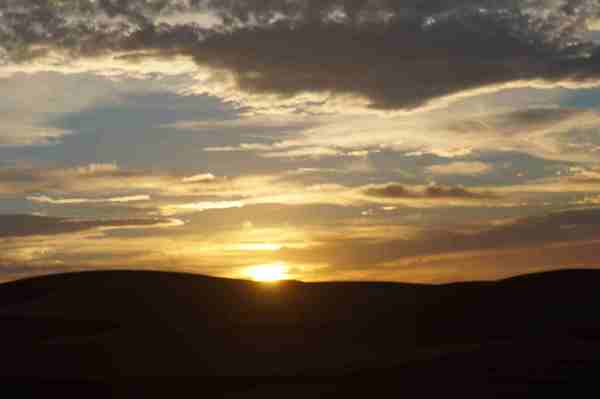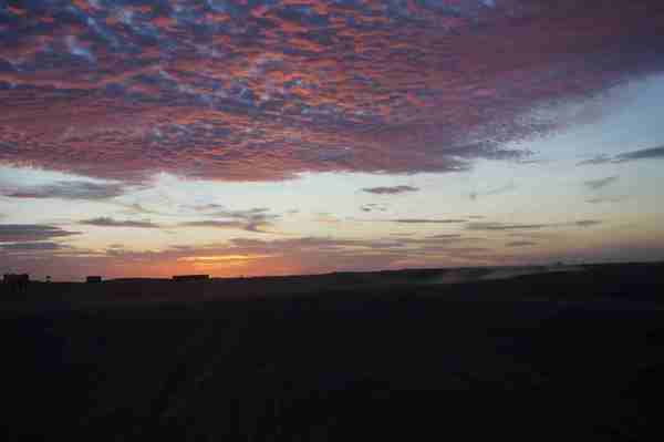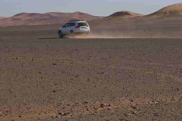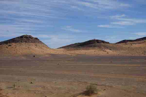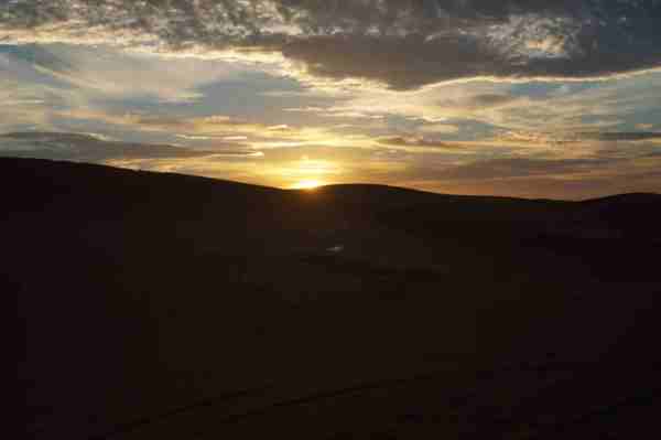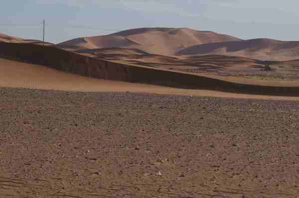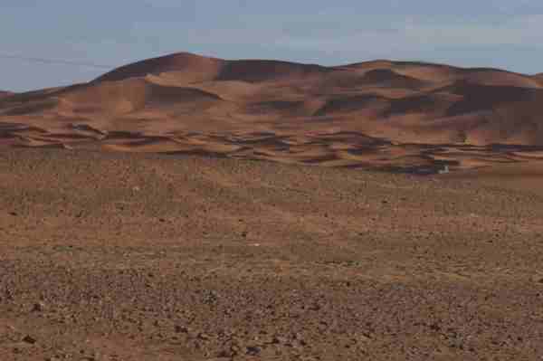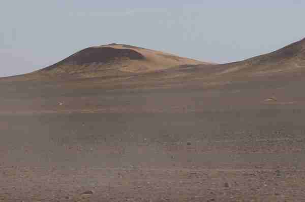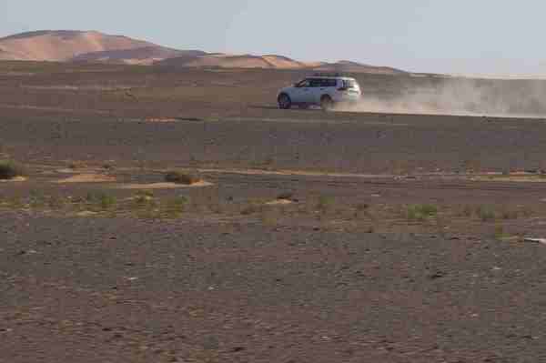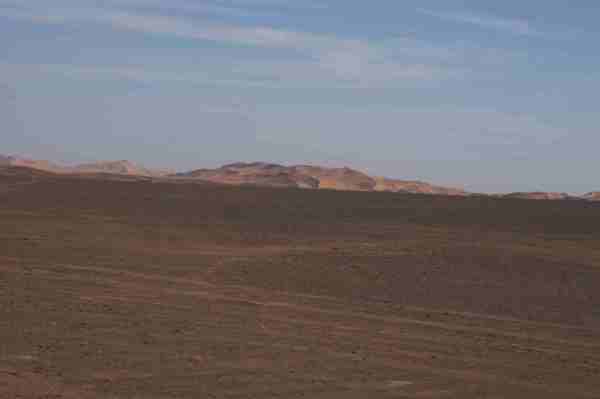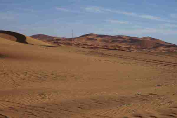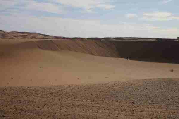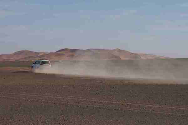 車行前方的盡頭隱隱出現黃色沙丘,然後慢慢的由小變大,一個二個而後連成一片緜延不斷的沙漠。