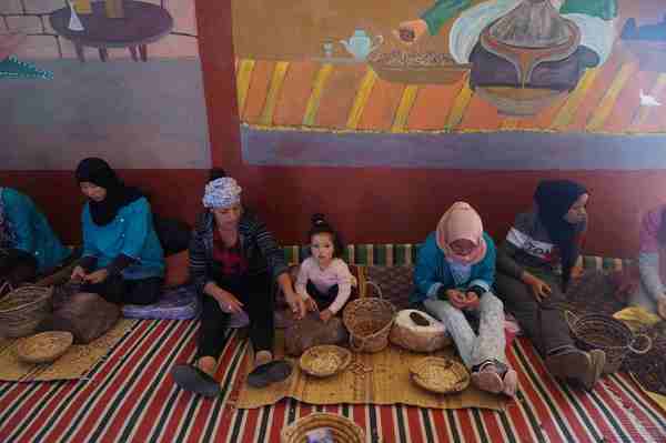 婦女現場表演阿甘果的去皮、碾製過程。