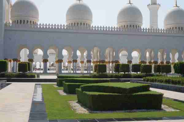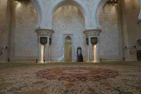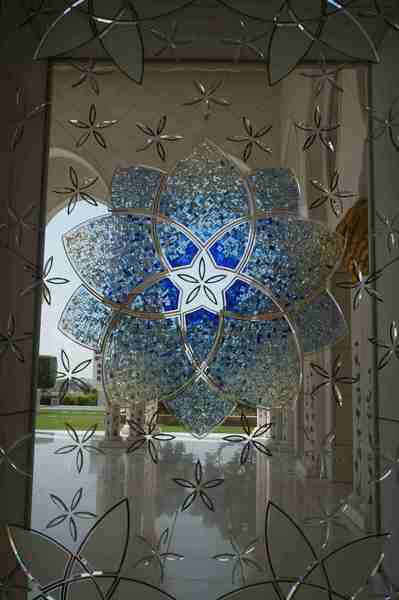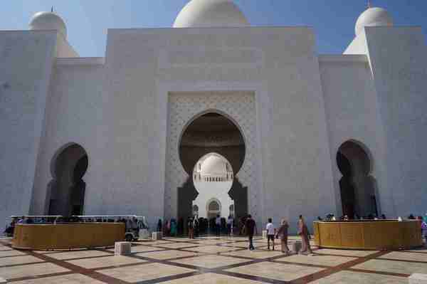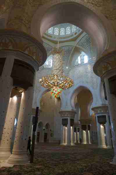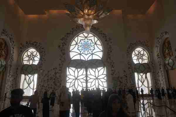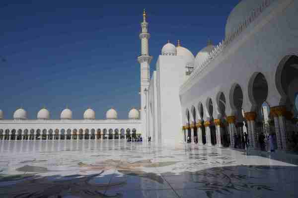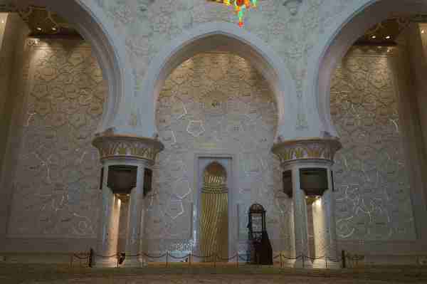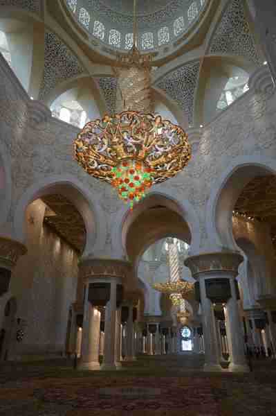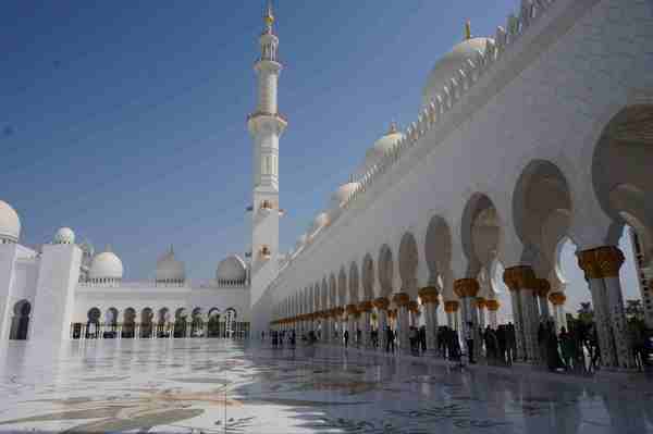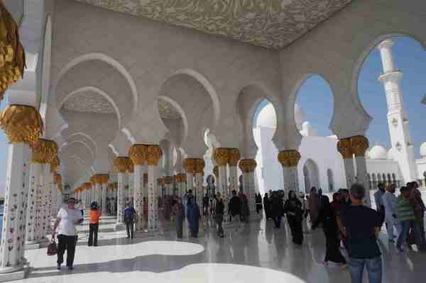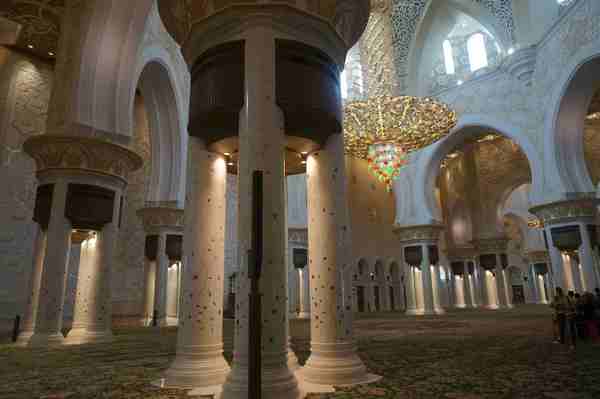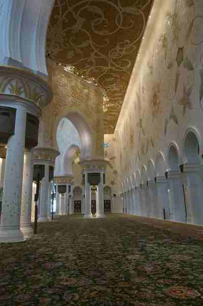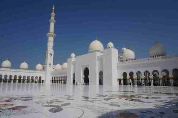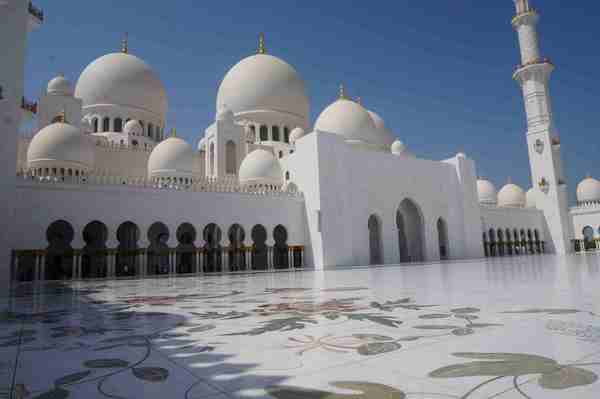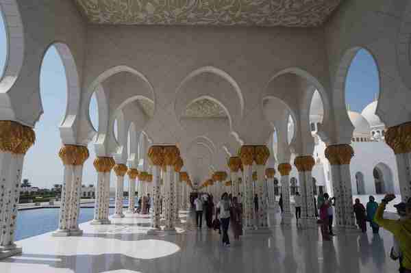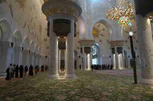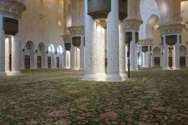 阿布達比大清真寺Sheikh Zayed Mosque,它是阿拉伯最大、全世界最美之一的清真寺,大廳裡一片光亮潔淨,純白的大理石牆和地板,攀滿彩磁作成的藤蔓雕花,柔和而細緻,透光的玻璃窗扇和門扉,雕琢著伊斯蘭風情的花樣紋飾;此外,還有質地柔軟綿密、色彩繽紛如花草,目前全世界最大的手織波斯地毯,據說是由伊朗東部的千名婦女花了兩年時間編織而成。