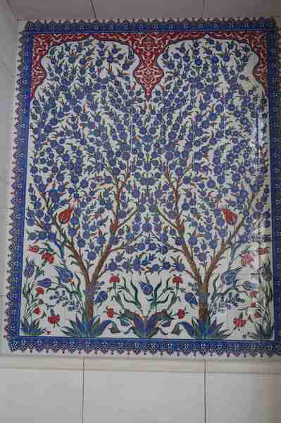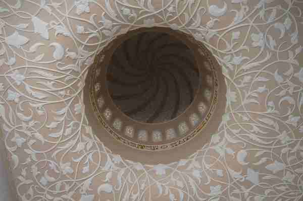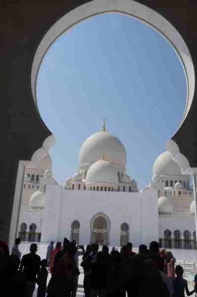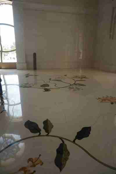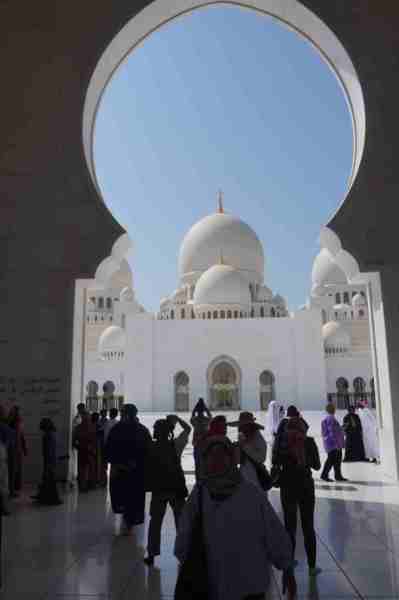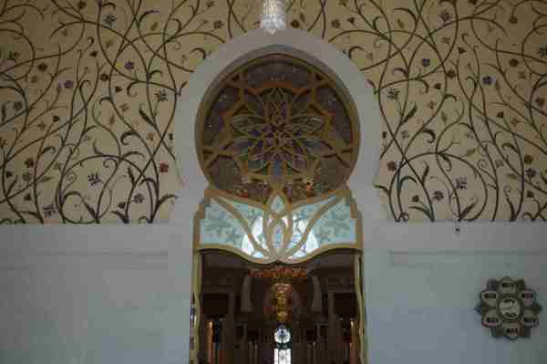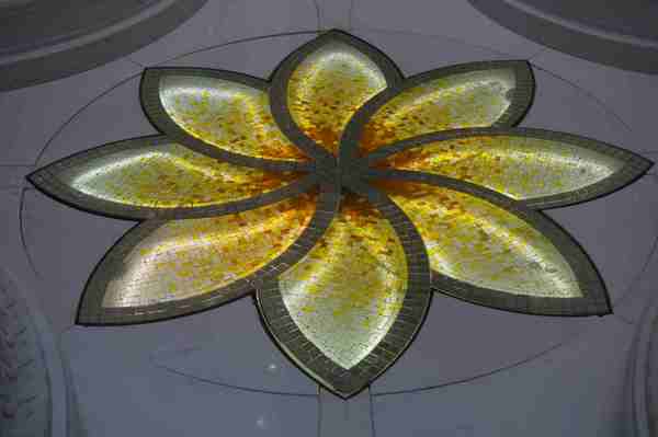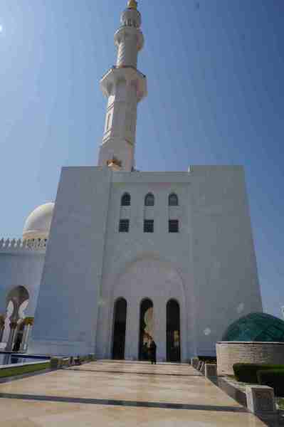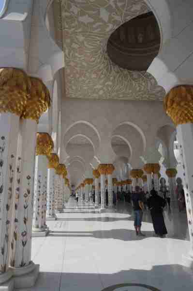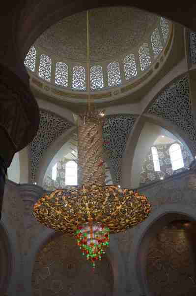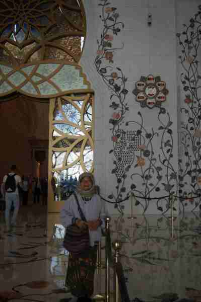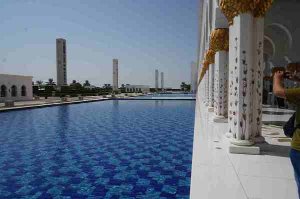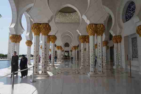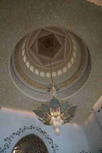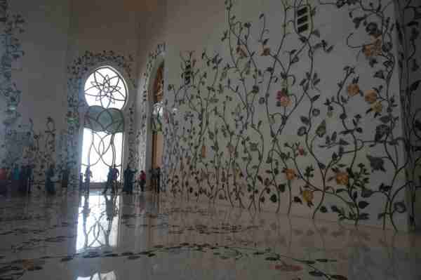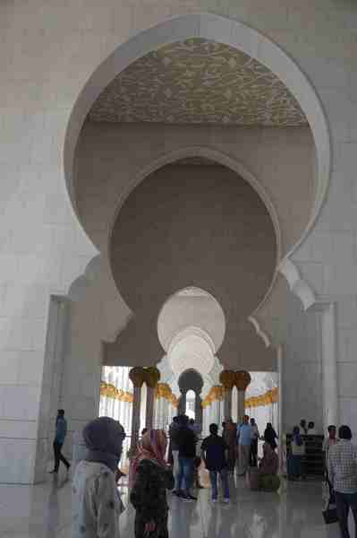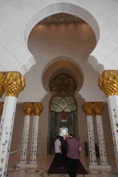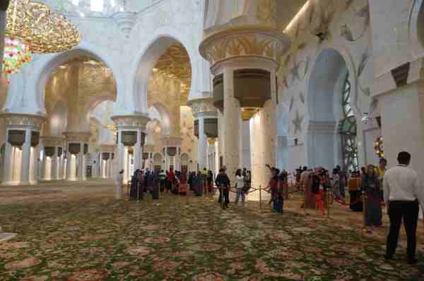 阿布達比大清真寺Sheikh Zayed Mosque,它是阿拉伯最大、全世界最美之一的清真寺,大廳裡一片光亮潔淨,純白的大理石牆和地板,攀滿彩磁作成的藤蔓雕花,柔和而細緻,透光的玻璃窗扇和門扉,雕琢著伊斯蘭風情的花樣紋飾;此外,還有質地柔軟綿密、色彩繽紛如花草,目前全世界最大的手織波斯地毯,據說是由伊朗東部的千名婦女花了兩年時間編織而成。