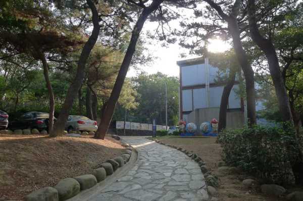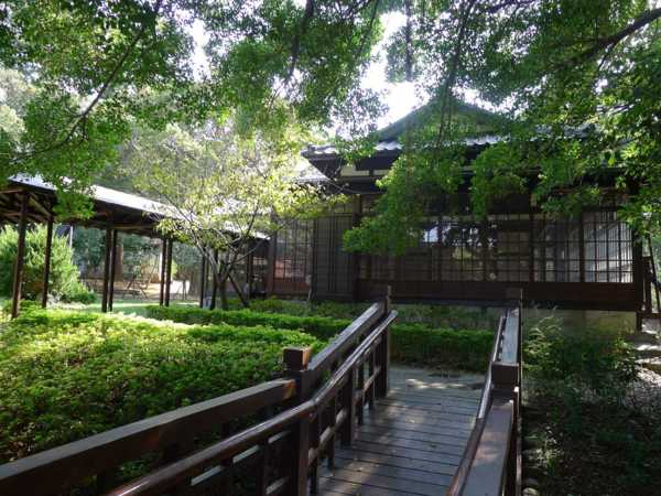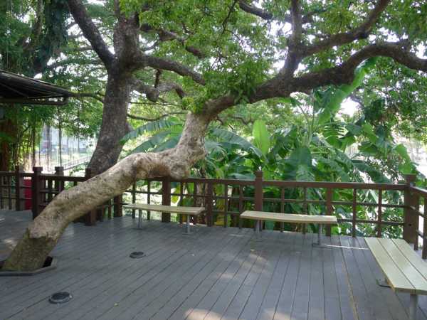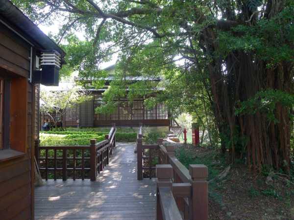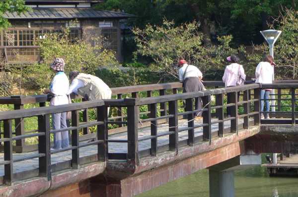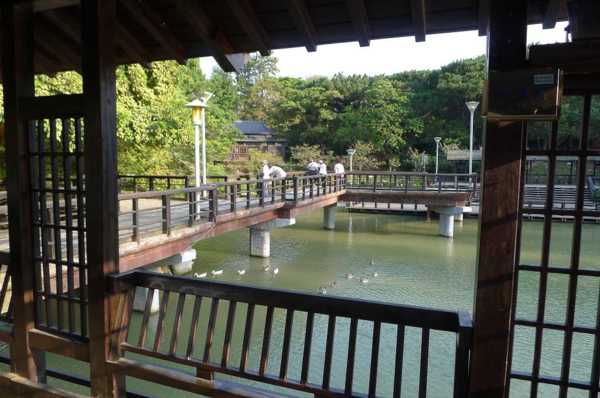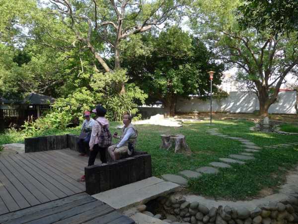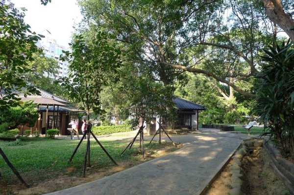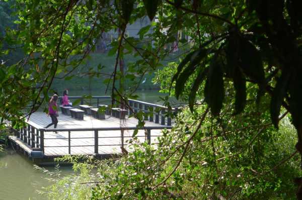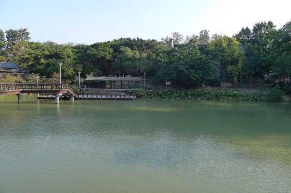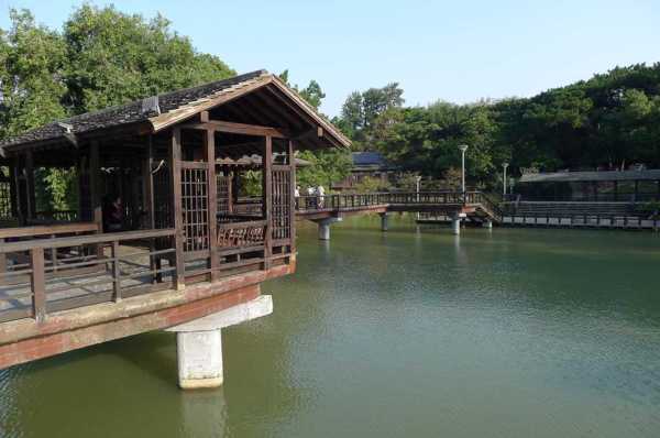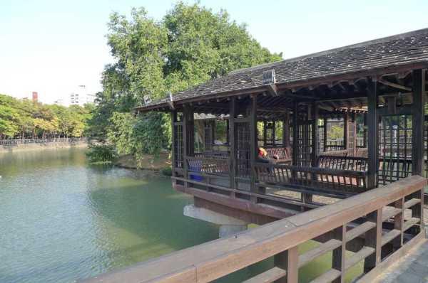 湖心以木棧道橫跨著的九曲橋點綴著涼亭,亭內遊人午後休憩孩童嘻戲,