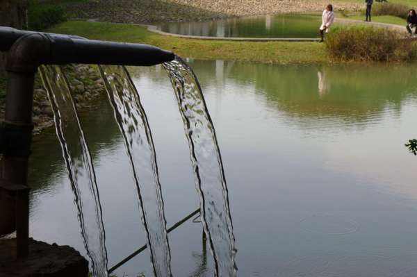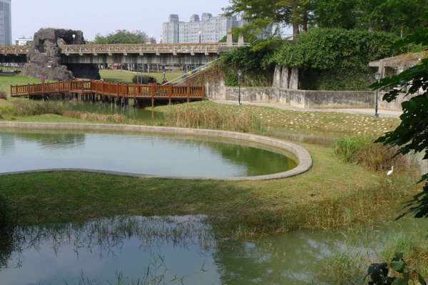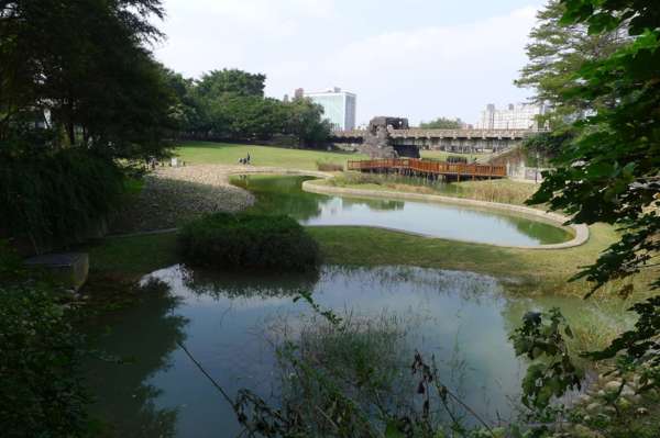 景觀天橋、兒童遊戲親水區、林蔭休閒區、涼亭、溜冰場,21公尺高之溫度、時間、