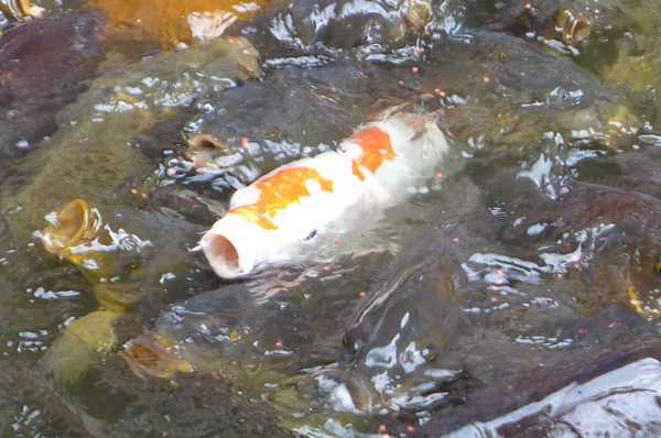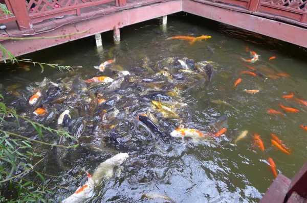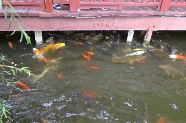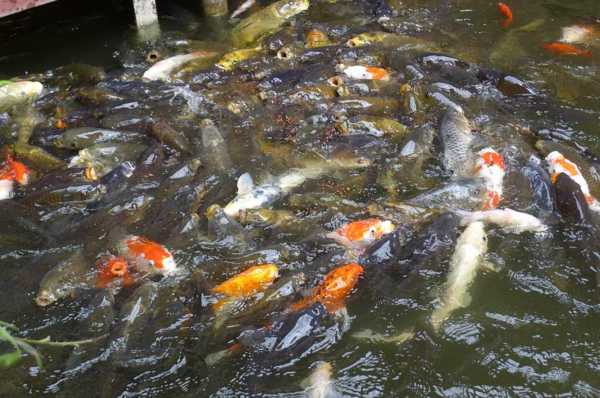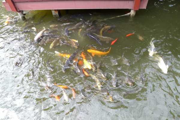 有人拿了約一斤重的魚飼料,大量往下倒,