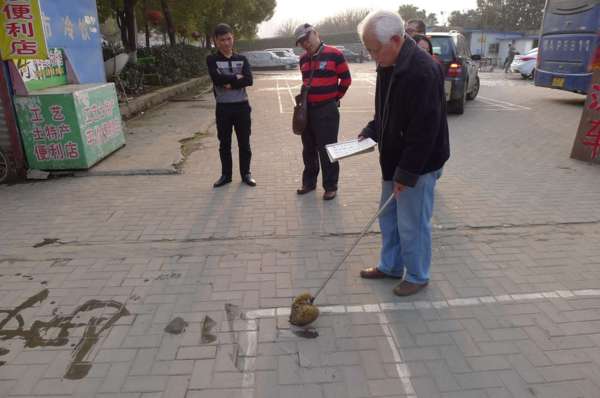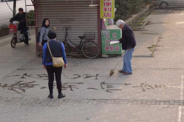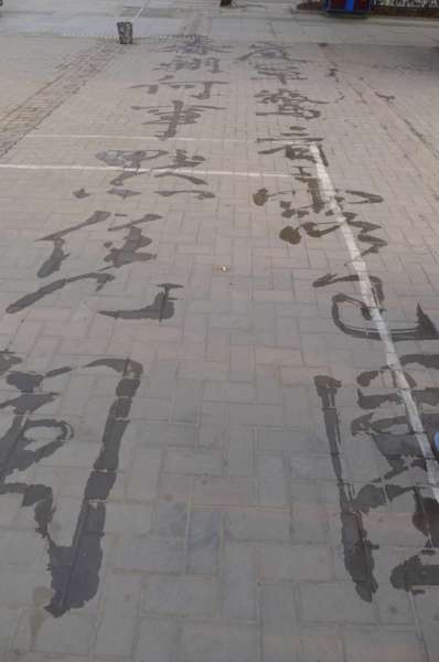 樓前 ,一長者在此以海綿筆沾清水練書法