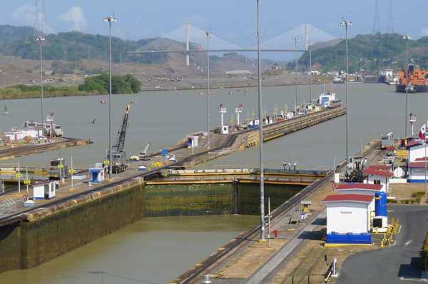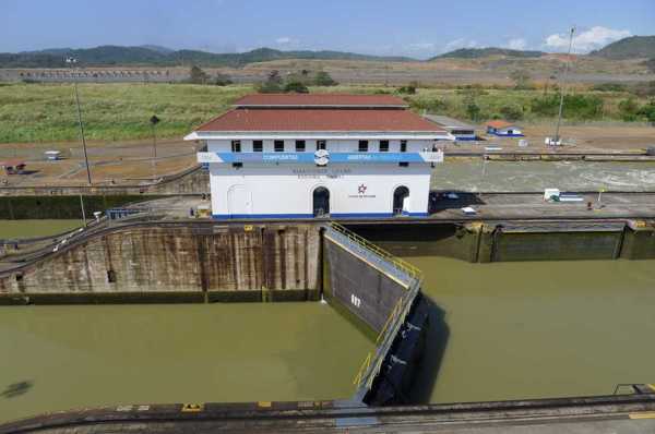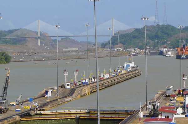 降到海拔16.5米,進入米拉弗洛湖,再經過一座雙層船閘降到海平面高度進入太平洋。