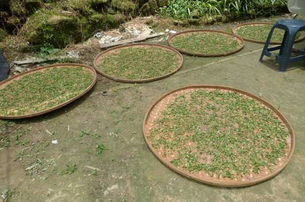 我們在喝茶聊天的當兒,一位志工採了一盤茶青來陰乾。