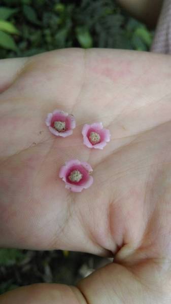 花序為聚繖狀圓錐花序,頂生,花數甚多;花淡紅色;花萼細小,長約 0.2 公分,深 5 裂;腺體 5 顆;花冠闊鐘形,徑 0.3~0.4 公分,深 5 裂或 4 裂,裂片倒披針形,淡紅色;雄蕊 5 枚,著生冠筒基部,不挺出於花外。
