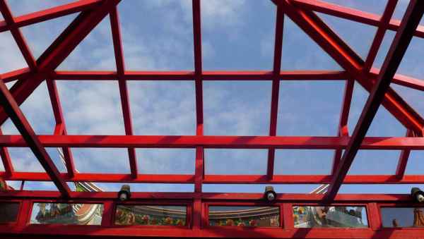三川殿與正殿之間為天井,加建遮雨棚以增加祭祀空間。