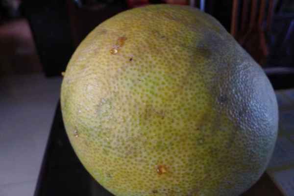 果實呈扁球形,果橫徑為14.6~17.5cm,果高為12.2~15.9cm,果重800~1,200g左右。開花期2~3月,成熟期10~11月。果面光滑,淡黃綠色,絨層為粉紅色,果肉淡粉紅色或粉紅色,瓢囊14~19,沙囊表面光亮,種子數為90~150粒左右,果汁糖度10~15度,酸度0.4~0.6%,甘味強。
