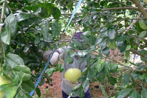 大弟用剪刀剪下柚子