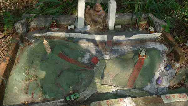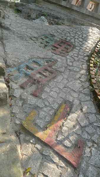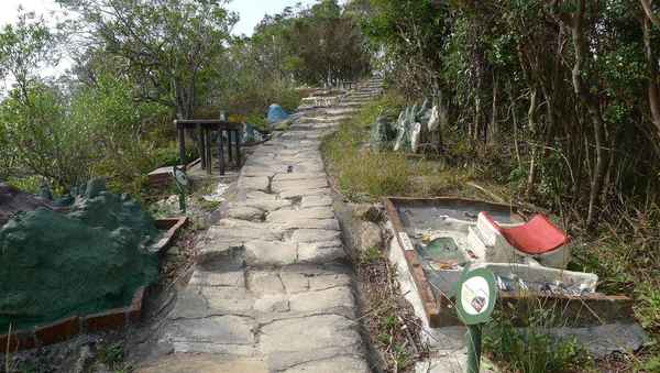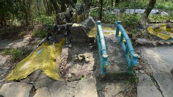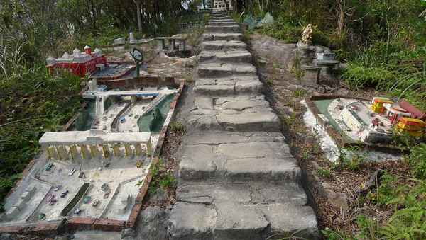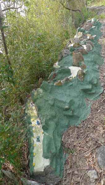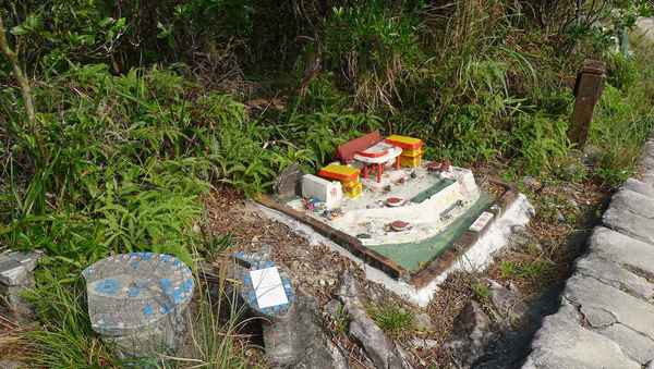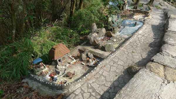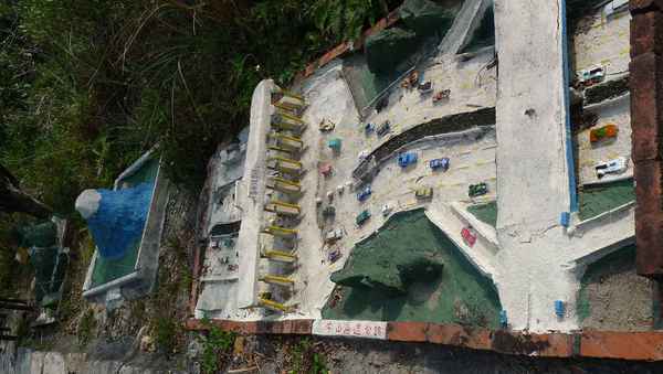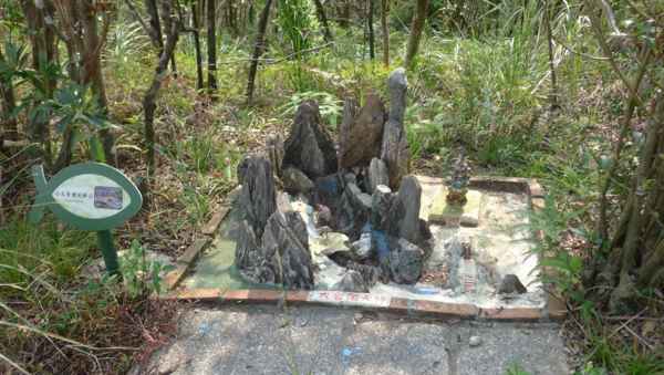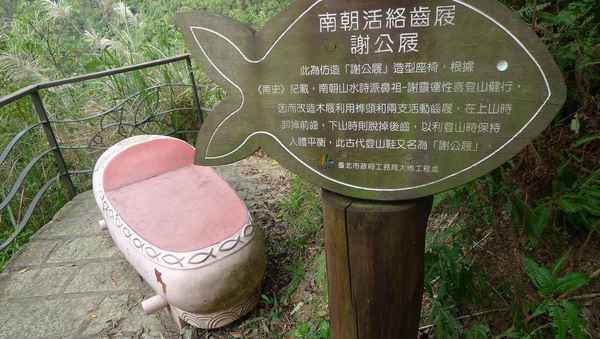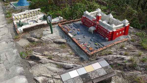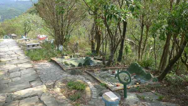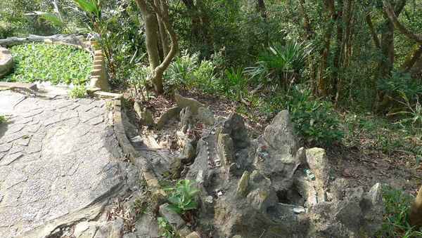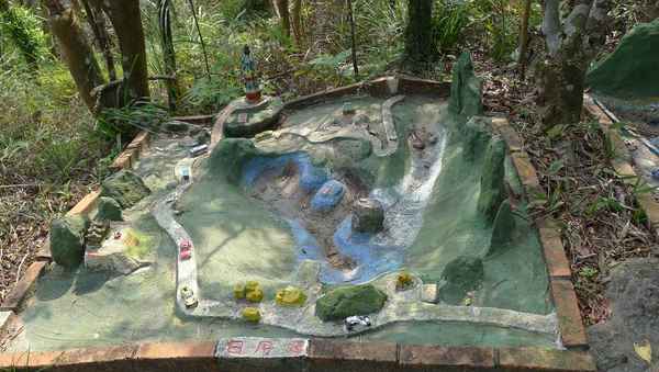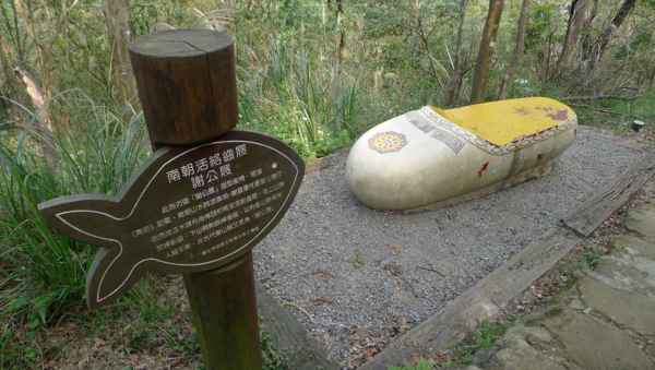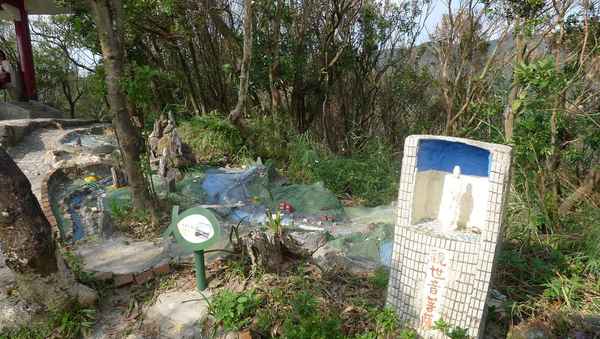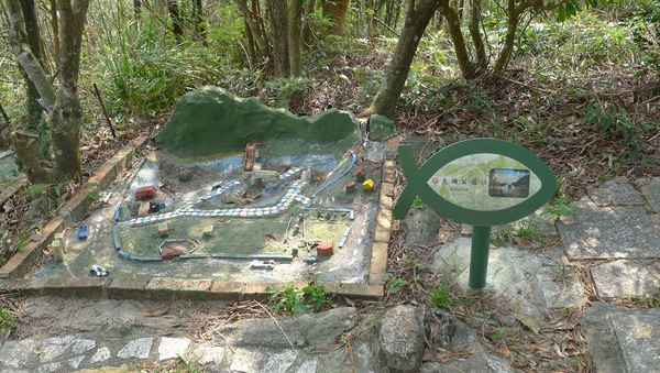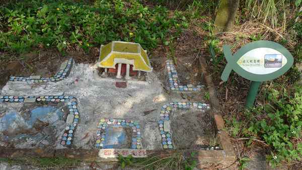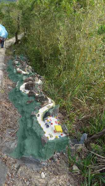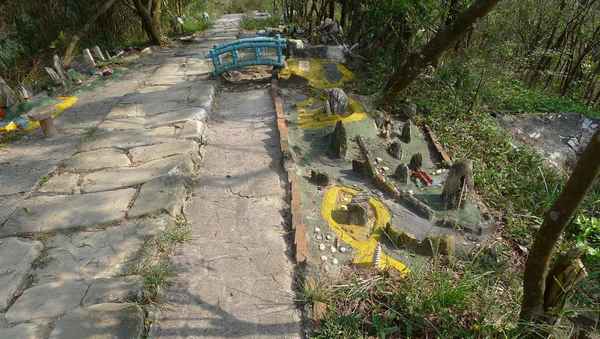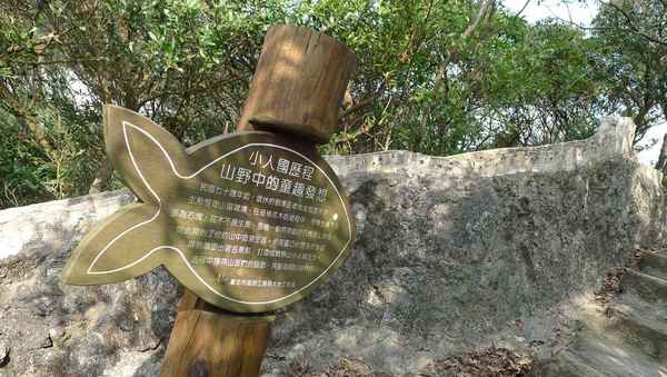 早期幽默有創意的山友,將車子、房子模型,以及世界各大景點,都濃縮在這一公里的步道中,猴子、萬里長城、小橋流水、彌勒佛……,鯉魚山的小人國沿路伴隨,綿延在步道的起伏之間,同時,也別忘了看看腳下鋪設「鯉魚山」的馬賽克磚喔!