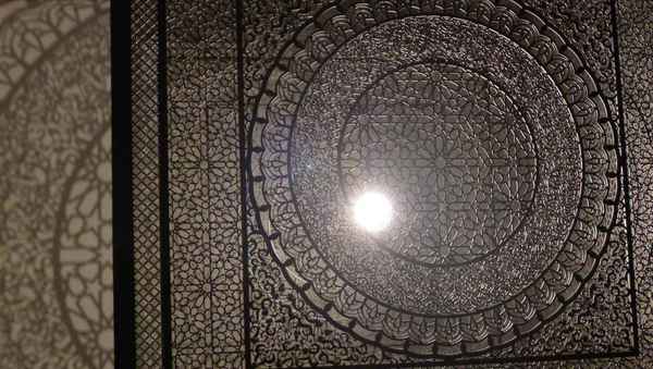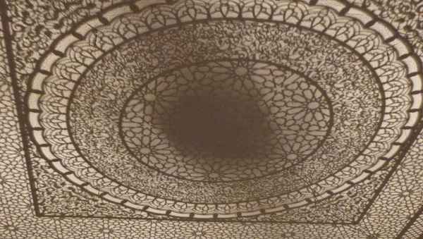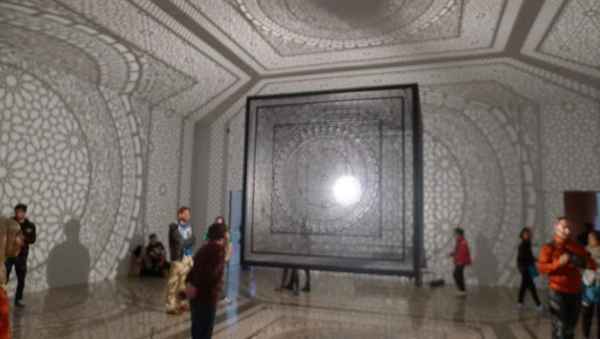 中間一個正方體,燈光把它的各面相圖案投射在房間六面。