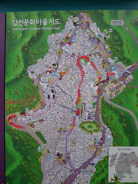 甘川洞文化村的歷史可追溯至50年代的韓戰,因為戰爭人們逐漸遷往高地居住,最多時高達4000人居住此處,在山丘上蓋了800多棟房子。2009年隨著「夢想釜山馬丘比丘」活動推展,在藝術家與當地居民努力下,嶄新的甘川洞文化村誕生,韓國熱門節目《Running Man》釜山特輯也曾在此拍攝,成為背包客好評不斷的必遊之地。